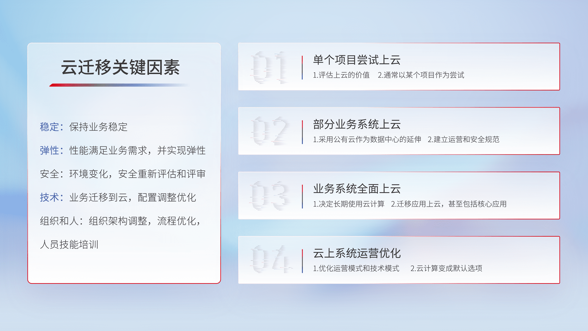 结合实际业务,,从规划设计、、云平台选型、、云原生改造、、、数据迁移、、、集成交付,,,迁移全过程为客户识别最佳上云路径,,,,做好风险识别管理,,,,设计网络架构、、身份权限、、安全审计合规、、、、操作审计、、日志审计、、、监控告警策略、、多站点容灾设计等,,,对云上基础设施进行整体规划,,,,提升IT治理水平,,,,以满足弹性、、、高可用、、、、高性能的需求。。。