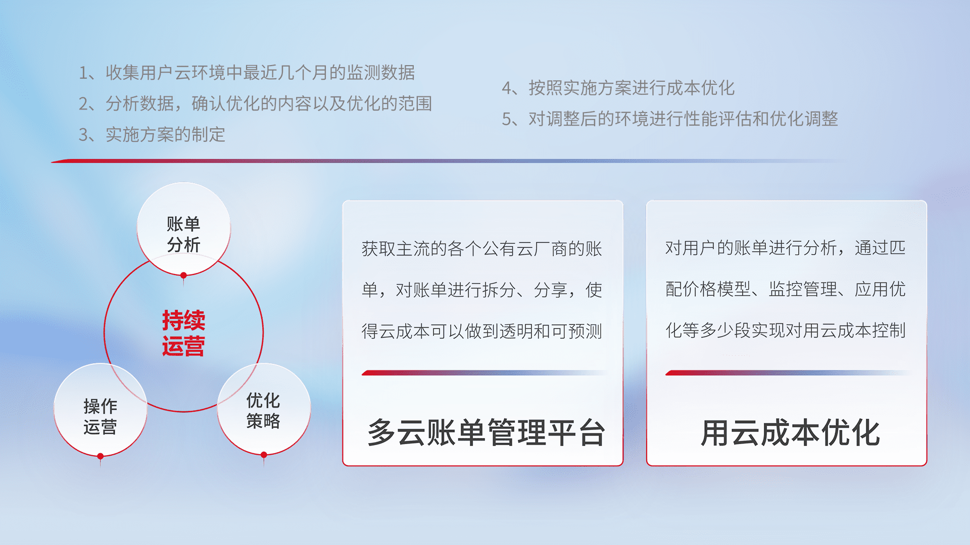 通过多云纳管,,以统一的资源数据模型把客户的云资源进行抽象和封装,,,进而实现对多云资源的统一操作,,保障云资源管理的可靠性、、、稳定性与可用性。。。量身定制化运维内容,,,,配置、、开发运维、、、、补丁管理、、备份、、、监控、、、、认证和访问管理、、、、审计和日常巡检等,,,,保障在用云过程中的可靠度,,稳定度以及高可用率。。。。