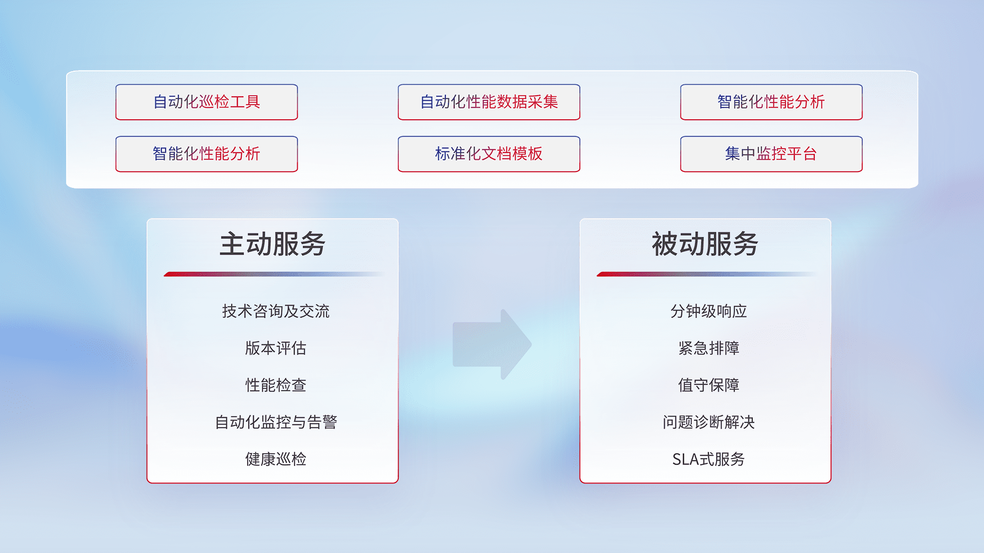 智能化工具和标准化文档,,保障服务质量,,提供主动服务(包含技术咨询、、、版本评估、、、、性能检查、、自动化监控与告警、、、、健康巡检)和被动服务包含(分钟级响应、、、、紧急排障、、值守保障、、、、问题诊断解决、、、、SLA服务)。。。。